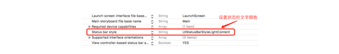 在 Info.plist 里增加一行 UIStatusBarStyle( Status bar style 也可以),這里可以設置兩個值,就是上面提到那兩個 UIStatusBarStyleDefault 和 UIStatusBarStyleLightContent 。