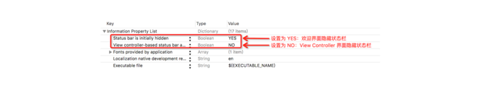如果想要通過代碼實現狀態欄隱藏,必須在 Info.plist 文件中添加 View controller-based status bar appearance