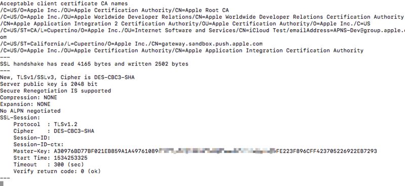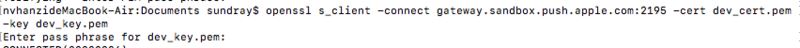 openssl s_client -connect gateway.sandbox.push.apple.com:2195 -cert dev_cert.pem -key dev_key.pem