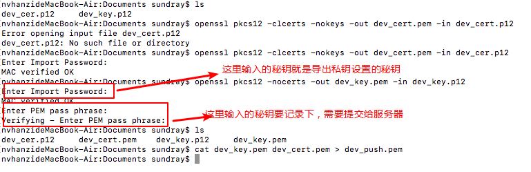 最終提交給服務器的為步驟5中 生成的dev_push.pem和轉換私鑰過程中新設置的秘鑰。開發證書也是按照這個步驟來生成。