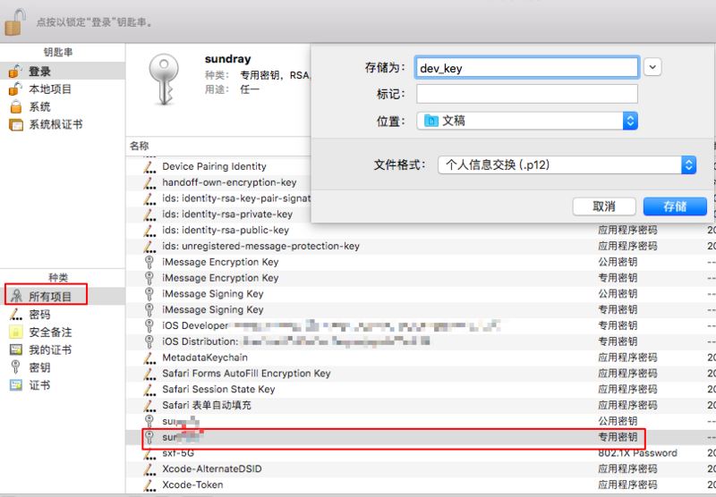 過程中生成的 .p12文件記得保留,我們在其他Mac上使用一些推送測試工具時,需要導入dev_key.p12或者pro_key.p12才能推送出消息。
