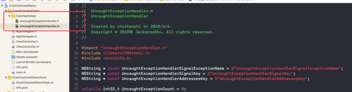 #import <Foundation/Foundation.h>#import <UIKit/UIKit.h>@interface UncaughtExceptionHandler : NSObject/*! * 異常的處理方法 * * @param install 是否開啟捕獲異常 * @param showAlert 是否在發生異常時彈出alertView */+ (void)installUncaughtExceptionHandler:(BOOL)install showAlert:(BOOL)showAlert;@end
