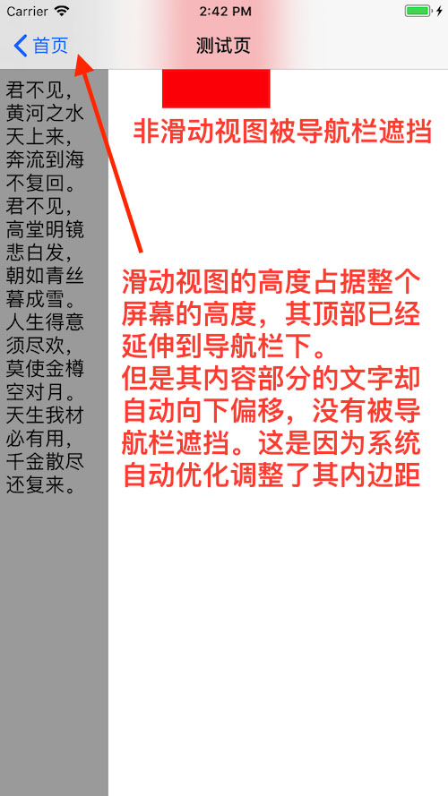 //UITextView是滑動視圖,內容自動向下偏移,不會被導航欄覆蓋UITextView *leftTextView = [[UITextView alloc] init];leftTextView.frame = CGRectMake(0, 0,100, kDeviceHeight); //leftTextView.backgroundColor = [UIColor lightGrayColor];leftTextView.text = @"君不見,黃河之水天上來,奔流到海不復回。君不見,高堂明鏡悲白發,朝如青絲暮成雪。人生得意須盡歡,莫使金樽空對月。天生我材必有用,千金散盡還復來。";leftTextView.font = [UIFont systemFontOfSize:18];leftTextView.editable = NO;[self.view addSubview:leftTextView]; //UIView是非滑動視圖,內容被導航欄部分覆蓋UIView *rightView= [[UIView alloc] initWithFrame:CGRectMake(150, 0, 100, 100)];rightView.backgroundColor = [UIColor redColor];[self.view addSubview:rightView];