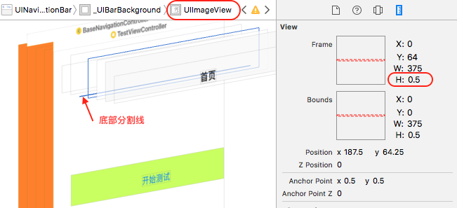 隱藏導航底部分割線也是我們偶爾會遇到的開發需求,首先我們可以通過Xcode的Debug View Hierarchy功能查看導航欄的視圖結構,效果如下: