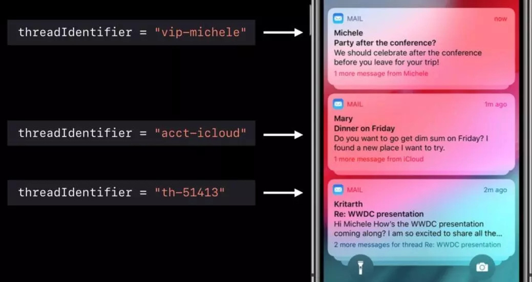 let content = UNMutableNotificationContent() content.title = "Notifications Team" content.body = "WWDC session after party" content.threadIdentifier = "notifications-team-chat"http://通過這個屬性設置分組,如果此屬性沒有設置則以APP為分組依據