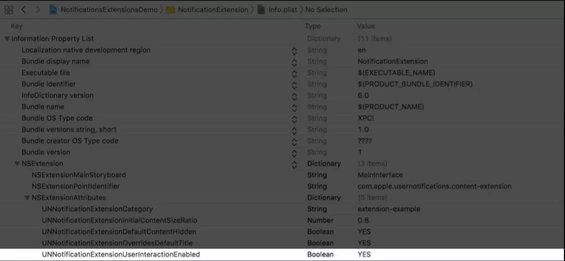 首先配置Notification Content Extention的 UUNNotificationExtensionUserInteractionEnabled 為 YES