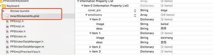 首先,表情包的圖片是用bundle的形式組織的,用PPSticker類表征一套表情包,用PPEmoji類表征某一個(gè)表情,用一個(gè)plist作為配置文件,存儲(chǔ)表情包的信息。