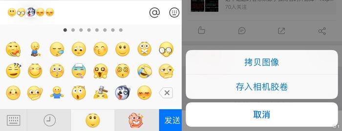 接下來(lái)看一下微博國(guó)際版,國(guó)際版調(diào)起表情鍵盤時(shí)是有光標(biāo)的,是一個(gè)"真正的"鍵盤,但是想要拖拽光標(biāo)的時(shí)候,很大概率上會(huì)觸發(fā)到保存圖片的行為(如下圖所示),導(dǎo)致根本沒(méi)辦法拖動(dòng)光標(biāo)。