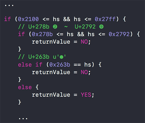 就是在 Emoji 判定方法中,過濾掉上述符號(對應的 Unicode 編碼為 U+278b ~ U+2792 和 U+263b),如下: