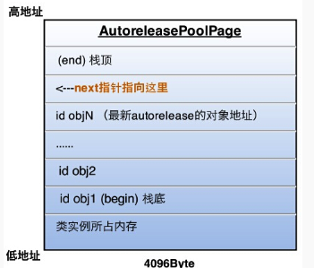 AutoreleasePoolPage每個對象會開辟4096字節(jié)內(nèi)存(也就是虛擬內(nèi)存一頁的大小),除了實例變量所占空間,剩下的空間全部用來儲存autorelease對象的地址。內(nèi)存結(jié)構(gòu)如圖: