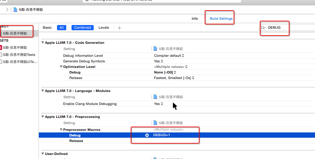 宏定義除了在類中用#define進行定義之外,在iOS開發過程中,我們還可以通過在Build Setting中進行配置宏,而在Build Setting中定義的宏在項目中會找不到,就是我們通過【command】+【鼠標單擊】會顯示一個【?】,無法跳到對應定義的位置,這時候可能就是配置在Build Setting中,例如我們經常見到的宏 DEBUG 就配置在配置在Build Setting中。