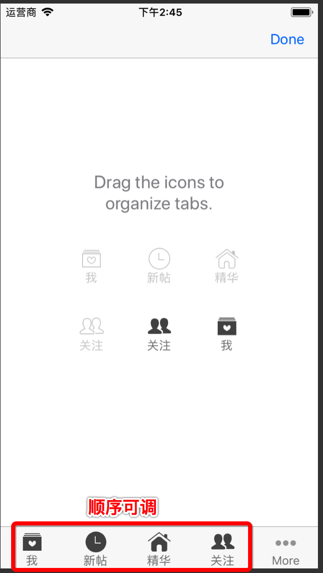 @implementation XMGTabBarController- (void)viewDidLoad { [super viewDidLoad]; //添加4個item bar UITableViewController *vc0 = [[UITableViewController alloc] init]; vc0.view.backgroundColor = [UIColor redColor]; vc0.tabBarItem.title = @"精華"; vc0.tabBarItem.image = [UIImage imageNamed:@"tabBar_essence_icon"]; vc0.tabBarItem.selectedImage = [UIImage imageNamed:@"tabBar_essence_click_icon"]; [self addChildViewController:vc0]; UIViewController *vc1 = [[UIViewController alloc] init]; vc1.view.backgroundColor = [UIColor blueColor]; vc1.tabBarItem.title = @"新帖"; vc1.tabBarItem.image = [UIImage imageNamed:@"tabBar_new_icon"]; vc1.tabBarItem.selectedImage = [UIImage imageNamed:@"tabBar_new_click_icon"]; [self addChildViewController:vc1]; UITableViewController *vc2 = [[UITableViewController alloc] init]; vc2.view.backgroundColor = [UIColor greenColor]; vc2.tabBarItem.title = @"關注"; vc2.tabBarItem.image = [UIImage imageNamed:@"tabBar_friendTrends_icon"]; vc2.tabBarItem.selectedImage = [UIImage imageNamed:@"tabBar_friendTrends_click_icon"]; [self addChildViewController:vc2]; UIViewController *vc3 = [[UIViewController alloc] init]; vc3.view.backgroundColor = [UIColor grayColor]; vc3.tabBarItem.title = @"我"; vc3.tabBarItem.image = [UIImage imageNamed:@"tabBar_me_icon"]; vc3.tabBarItem.selectedImage = [UIImage imageNamed:@"tabBar_me_click_icon"]; [self addChildViewController:vc3]; //下面的方法也是可以的,推薦使用下面的方法// [self addChildViewController:@[vc0,vc1,vc2,vc3]]; }
