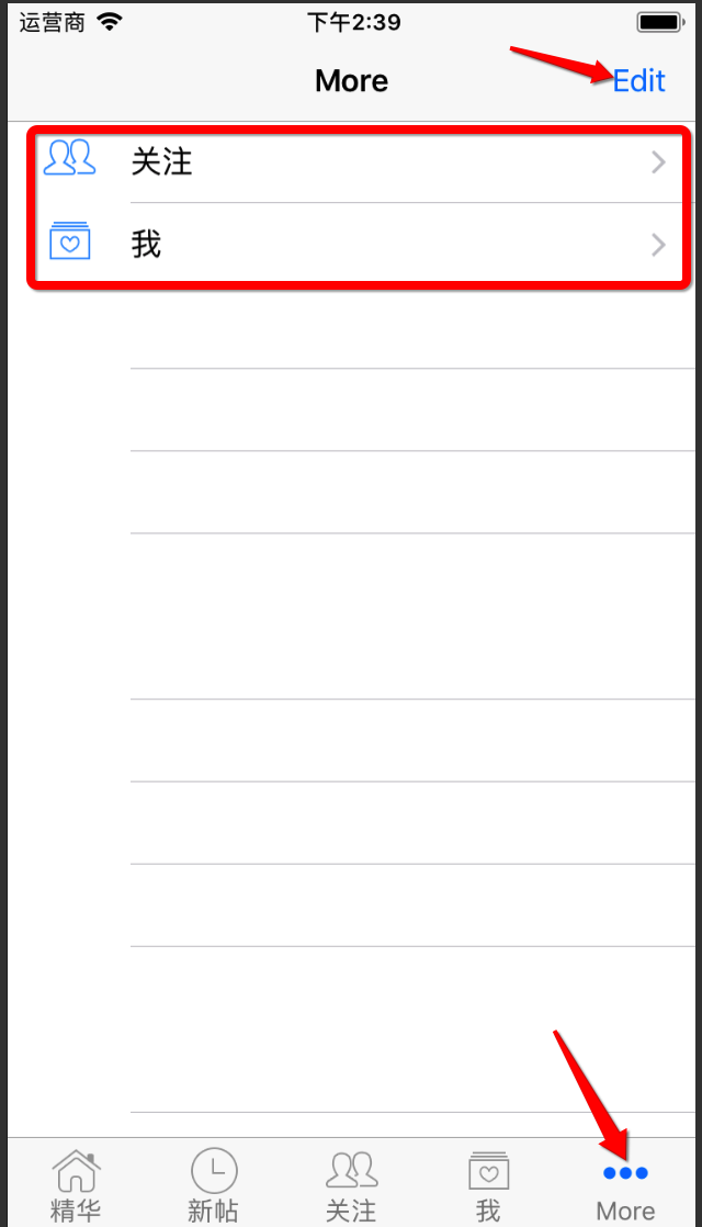 每一個barItem都必須對應一個ViewController,可以是一般的ViewController,也可以是UINavigationController barItem對應的ViewController或UINavigationController的frame如果自定義設置了,注意不要遮擋最下面的TabBar條 barItem的順序與添加到UITabBarController的順序保持一致當添加的barItem個數 <= 5個時,均勻分布在最下面的bar條上,如上圖所示的4個當添加的barItem個數 > 5個時,會只顯示前四個添加的barItem,然后加上一個【more】,點擊【more】彈出一個列表可選,并且列表的右上角有一個【edit】按鈕,點擊之后可以調整barItem的顯示順序,如下圖所示,所以TabBar + NavigationController框架下的barItem個數最好不要超過5個,否則用戶體驗不是很好
