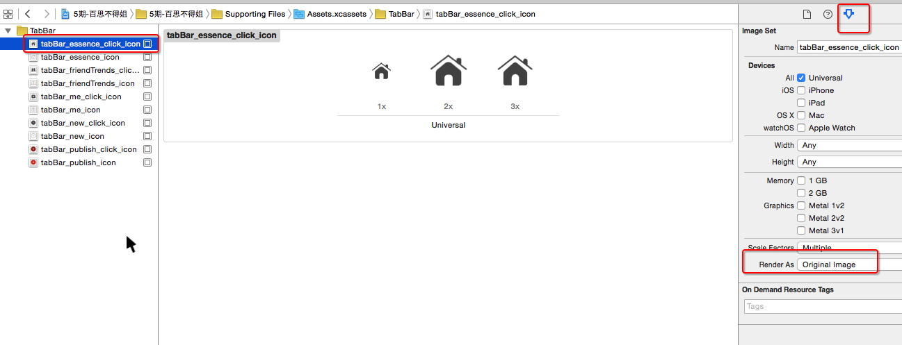 // 加載圖片UIImage *tempImage = [UIImage imageNamed:@"tabBar_essence_click_icon"];// 產生一張不會進行自動渲染的圖片UIImage *selectedImage = [tempImage imageWithRenderingMode:UIImageRenderingModeAlwaysOriginal];vc.tabBarItem.selectedImage = selectedImage;