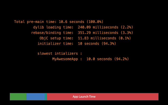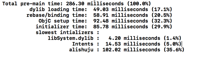 設置好后把程序跑起來,控制臺會有如下輸出,pre-main階段各過程的耗時一覽無余(Apple這個Demo有點過于夸張...)