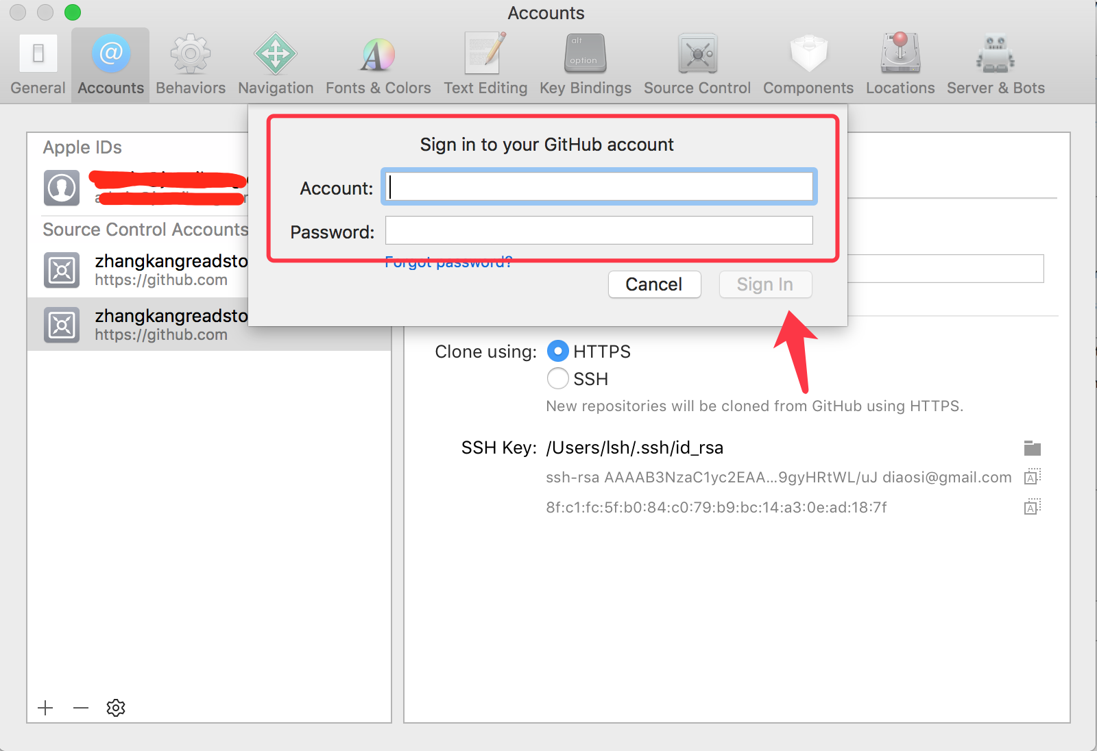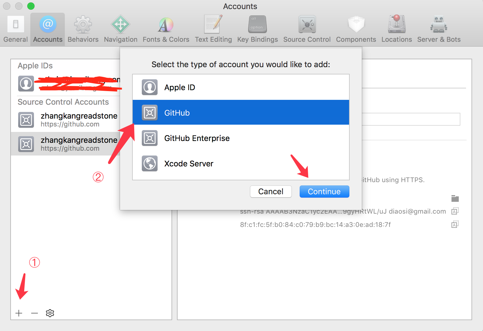 GitHub上的操作我們已經完成,接下來就是在Xcode上的操作了。首先,我們需要在Xcode上添加我們的GitHub賬號,方便我們后面的鏈接和提交。具體操作簡述為下面5步: