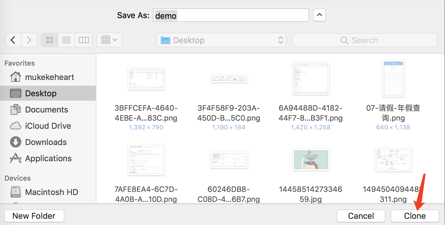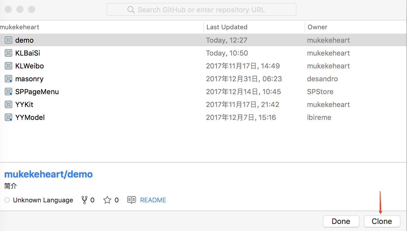 選擇【Xcode-Source Control】-->【Clone】,會出現如下圖2所示的我們GitHub中的所有repositories倉庫在出現的所有repositories倉庫頁面中,我們選擇要鏈接的倉庫進行【clone】,這里我們選擇我們先創建的倉庫【demo】,然后點擊右下角的【clone】點擊【clone】之后再出現的位置我們選擇自己要放置的位置即可,我這里選擇放在桌面上回到桌面,我們看到從GitHub上clone下來的為【demo】的倉庫資料