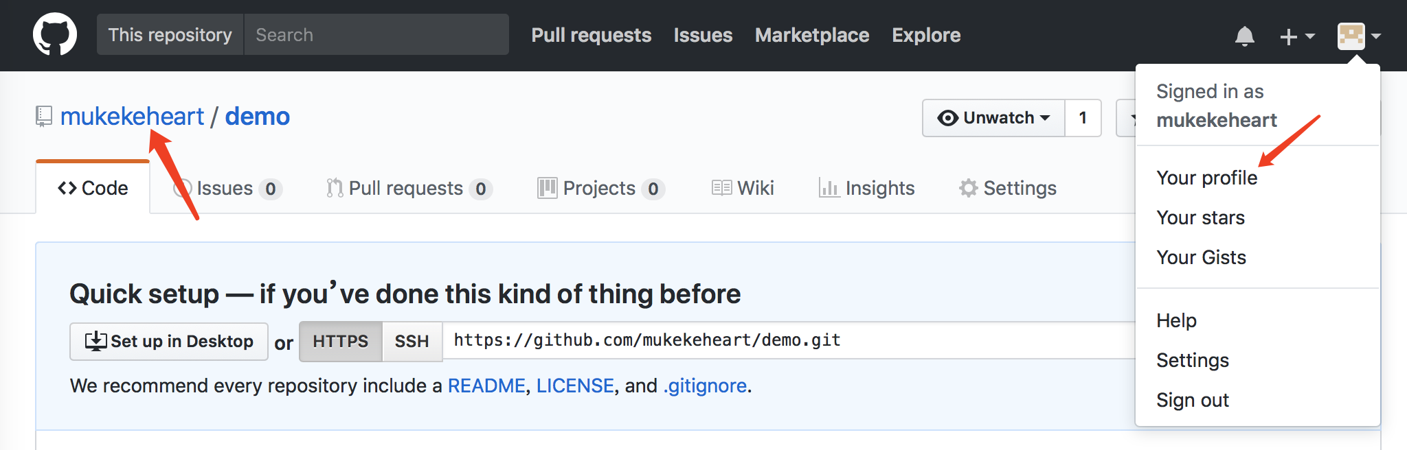 創建完倉庫之后,出現如下圖左邊所示的界面,我們點擊下圖左邊圖兩個箭頭所示的地方都可以查看我們賬號下的所有倉庫,我們可以看到剛剛創建的倉庫如下圖右邊圖所示。