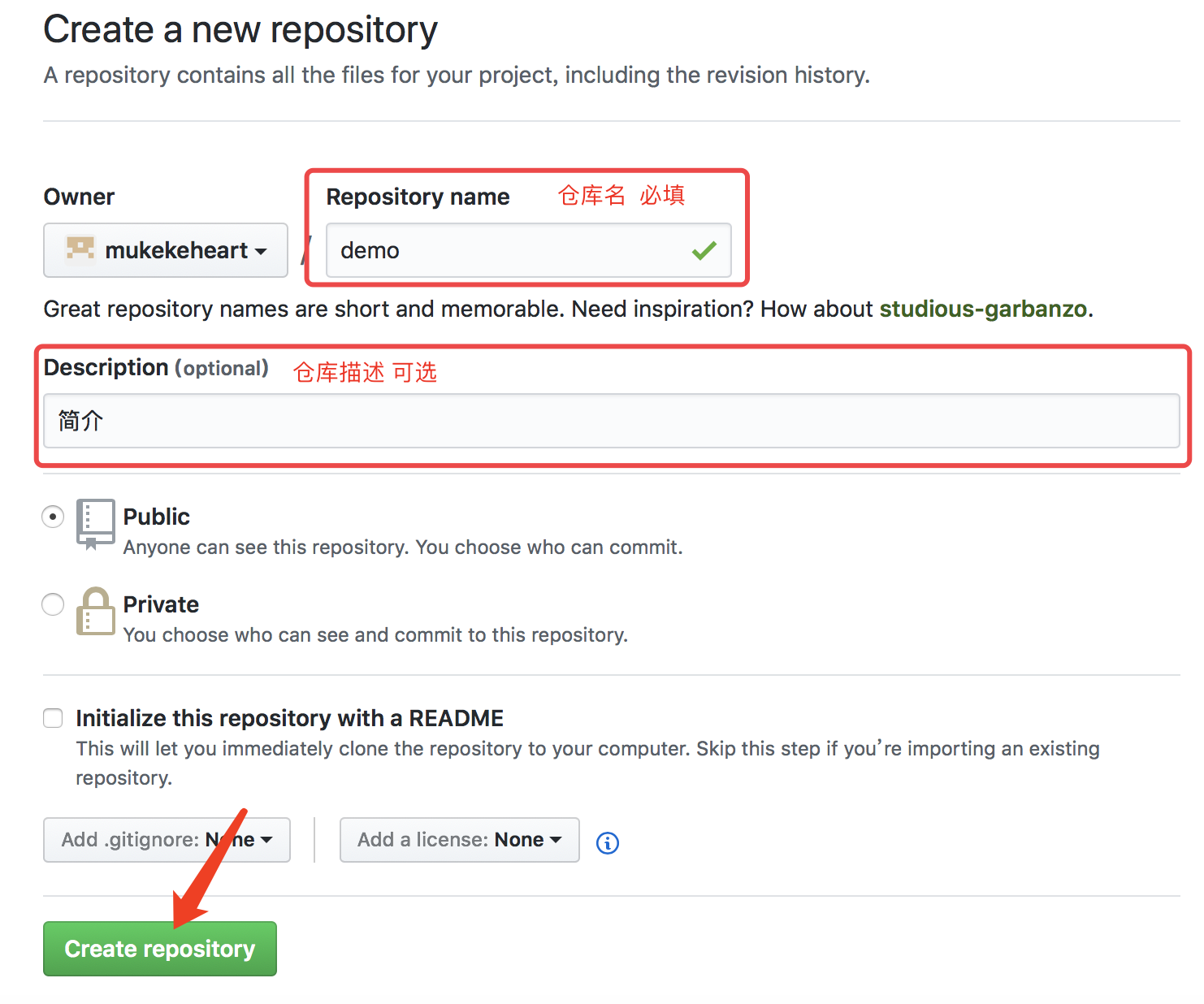 登陸后點擊下圖左邊圖的所示的【+】號,選擇【New respository】,出現下圖右邊圖所示的界面在下圖右邊圖所示的界面填寫倉庫名稱和倉庫描述,然后點擊最下面的【create respository】按鈕即完成了創建