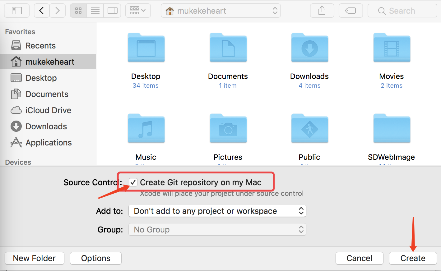 上面簡單介紹了一下如何查看系統隱藏的文件。接下來我們看如何將我們的項目連接到項目,這一步很簡單,就是要將我們待鏈接的項目放到剛剛從GitHub上clone下來的文件夾中就可以了。但是有一個前提就是創建該項目的時候不要選擇【create Git respository on my mac】選項,注意是不要。如下圖所示。