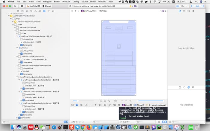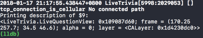 CHDeclareClass(_TtC10LiveTrivia18LiveViewController)CHOptimizedMethod(0, self,void,_TtC10LiveTrivia18LiveViewController,viewDidLoad){ CHSuper(0, _TtC10LiveTrivia18LiveViewController,viewDidLoad); UIWindow *win = [UIApplication sharedApplication].keyWindow; UIView *view = CHIvar(self, _view, __strong UIView *); CGFloat offsetY = 80; UIWebView *web = [[UIWebView alloc] initWithFrame:CGRectMake(0, CGRectGetHeight(view.frame)/2 + offsetY, CGRectGetWidth(view.frame), CGRectGetHeight(view.frame)/2 - offsetY)]; web.layer.cornerRadius = 4; web.layer.masksToBounds = YES; [win addSubview:web]; objc_setAssociatedObject(self, @"searchWeb", web, OBJC_ASSOCIATION_RETAIN_NONATOMIC); UIButton *moveWeb = [UIButton buttonWithType:UIButtonTypeSystem]; [moveWeb setTitle:@"Move" forState:UIControlStateNormal]; [moveWeb addTarget:self action:@selector(moveWebAction:) forControlEvents:UIControlEventTouchUpInside]; [moveWeb setFrame:CGRectMake(0, 0, CGRectGetWidth(web.frame), 45)]; moveWeb.backgroundColor = [UIColor whiteColor]; [web addSubview:moveWeb]; NSLog(@"%@",view.subviews[1].subviews[1]); UIView *questionView = view.subviews[1].subviews[1]; [questionView addObserver:self forKeyPath:@"alpha" options:NSKeyValueObservingOptionNew context:nil]; UILabel *qaLabel = questionView.subviews[3].subviews.firstObject; UIButton *option1 = questionView.subviews[5].subviews[0]; UIButton *option2 = questionView.subviews[5].subviews[1]; UIButton *option3 = questionView.subviews[5].subviews[2]; objc_setAssociatedObject(self, @"qaLabel", qaLabel, OBJC_ASSOCIATION_RETAIN_NONATOMIC); objc_setAssociatedObject(self, @"opation1", option1, OBJC_ASSOCIATION_RETAIN_NONATOMIC); objc_setAssociatedObject(self, @"opation2", option2, OBJC_ASSOCIATION_RETAIN_NONATOMIC); objc_setAssociatedObject(self, @"opation3", option3, OBJC_ASSOCIATION_RETAIN_NONATOMIC); NSLog(@"%@--%@---%@---%@",qaLabel,option1,option2,option3);}