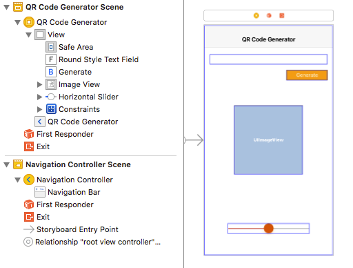 打開 Main.storyboard 文件,在當(dāng)前控制器中嵌入導(dǎo)航控制器,并添加標(biāo)題 QR Code Generator :