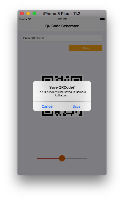 - (IBAction)tap:(id)sender{ // 添加提示框 UIAlertController *alertController = [UIAlertController alertControllerWithTitle:@"Save QRCode?" message:@"The QRCode will be saved in Camera Roll album." preferredStyle:UIAlertControllerStyleAlert]; UIAlertAction *saveAction = [UIAlertAction actionWithTitle:@"Save" style:UIAlertActionStyleDefault handler:^(UIAlertAction * _Nonnull action) { // 保存二維碼圖像 [self saveQRCodeImage]; }]; UIAlertAction *cancelAction = [UIAlertAction actionWithTitle:@"Cancel" style:UIAlertActionStyleCancel handler:nil]; [alertController addAction:saveAction]; [alertController addAction:cancelAction]; [self presentViewController:alertController animated:YES completion:nil];}