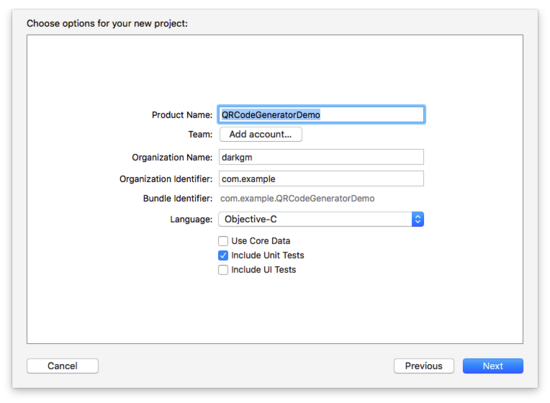 打開 Xcode ,創(chuàng)建一個(gè)新的項(xiàng)目( File/New/Project.. .),選擇 iOS 一欄下的 Application 中的 Single View Application 模版,然后點(diǎn)擊 Next ,填寫項(xiàng)目選項(xiàng)。在 Product Name 中填寫 QRCodeGeneratorDemo ,選擇 Objective-C 語言,點(diǎn)擊 Nex t,選擇文件位置,并單擊 Create 創(chuàng)建項(xiàng)目。