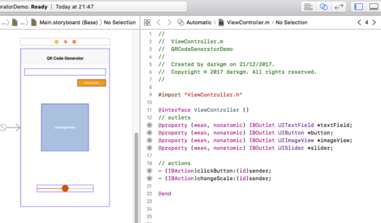 - (IBAction)clickButton:(id)sender{ if (self.qrcodeImage == nil) { if ([self.textField.text isEqualToString:@""]) { return; } [self generateQRCodeImage]; [self.textField resignFirstResponder]; [self.button setTitle:@"Clear" forState:UIControlStateNormal]; } else { [self clearQRCodeImage]; [self.button setTitle:@"Generate" forState:UIControlStateNormal]; } self.textField.enabled = !self.textField.enabled; self.slider.hidden = !self.slider.hidden;}