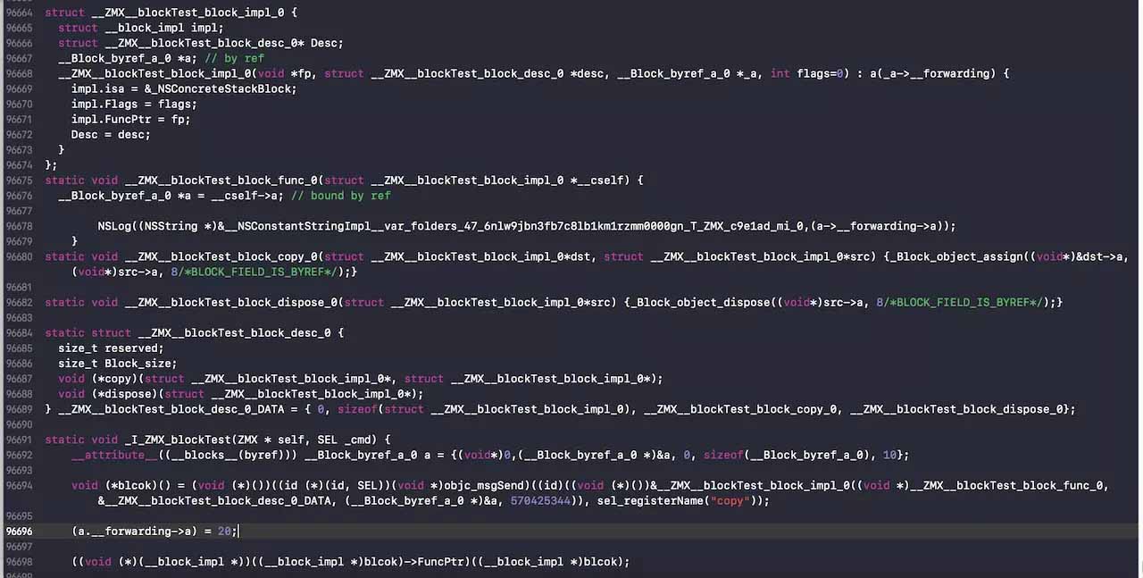 static void __ZMX__blockTest_block_func_0(struct __ZMX__blockTest_block_impl_0 *__cself) { __Block_byref_a_0 *a = __cself->a; // bound by ref NSLog((NSString *)&__NSConstantStringImpl__var_folders_47_6nlw9jbn3fb7c8lb1km1rzmm0000gn_T_ZMX_c9e1ad_mi_0,(a->__forwarding->a)); }