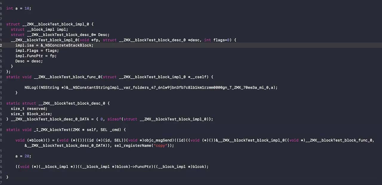 struct __ZMX__blockTest_block_impl_0 { struct __block_impl impl; struct __ZMX__blockTest_block_desc_0* Desc; int a; __ZMX__blockTest_block_impl_0(void *fp, struct __ZMX__blockTest_block_desc_0 *desc, int _a, int flags=0) : a(_a) { impl.isa = &_NSConcreteStackBlock; impl.Flags = flags; impl.FuncPtr = fp; Desc = desc; }};