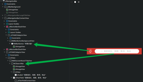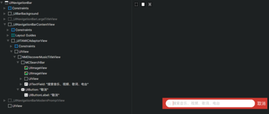 網易云音樂首頁和搜索頁面的導航欄視圖層級,titleView都使用MCSearchBar來實現,并且設置了導航欄左右兩邊的按鈕 。這類似上文所說的第二種思路。