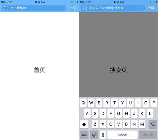 這時候問題又出現了,點擊搜索頁面的取消按鈕,沒有跳回首頁而是還在這個頁面。但是可以看到屏幕的閃動。通過打印消息發現,點了取消按鈕,執行了首頁的- (BOOL)searchBarShouldBeginEditing:(UISearchBar *)searchBar方法。 仔細推敲之后想明白了原因是沒有取消第一響應者,加上導航欄的交互機制,pop到上個頁面的時候并不會進行頁面刷新導致了這個問題。 解決辦法在首頁要push搜索頁面的時候取消第一響應者