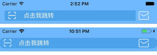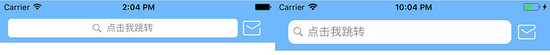 // navigation buttom UIButton *messageButton = [UIButton buttonWithType:UIButtonTypeSystem]; [messageButton setImage:[UIImage imageNamed:@"msg"] forState:UIControlStateNormal]; messageButton.bounds = CGRectMake(0, 0, 30, 30); UIBarButtonItem *messageBarButton = [[UIBarButtonItem alloc] initWithCustomView:messageButton]; self.navigationItem.rightBarButtonItem = messageBarButton; // search bar UIImageView *leftView = [[UIImageView alloc] initWithImage:[UIImage imageNamed:@"scan"]]; leftView.bounds = CGRectMake(0, 0, 24, 24); self.ohSearchBar = [[OHSearchBar alloc] initWithFrame:CGRectMake(0, 0, SCREEN_WIDTH, 44) placeholder:@"點擊我跳轉" textFieldLeftView:leftView showCancelButton:NO tintColor:[UIColor clearColor]]; self.navigationItem.titleView = self.ohSearchBar;