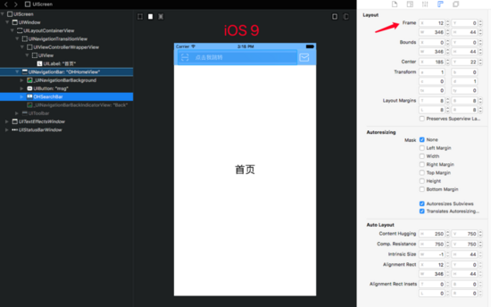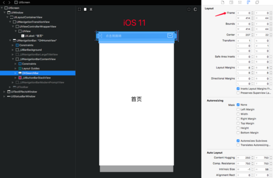 查看視圖層級會發現,iOS 11以下,設置titleView,x的默認坐標居然是12,而iOS 11是0。所以設置textField的x坐標的話,在iOS 11下必須多出12才會是一致的位置。