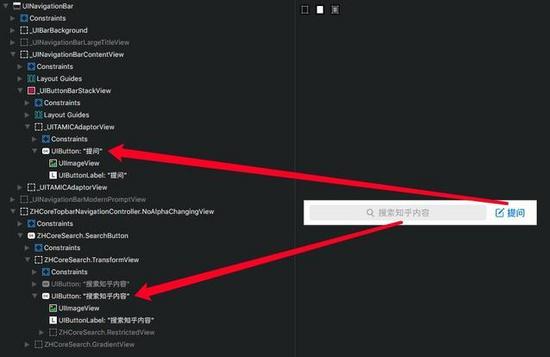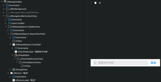 圖中可以清楚看到知乎首頁導航欄由2個button組成,搜索頁面使用了textField,這類似上文提到的第三種思路。