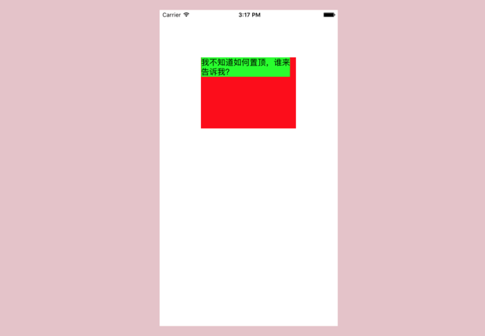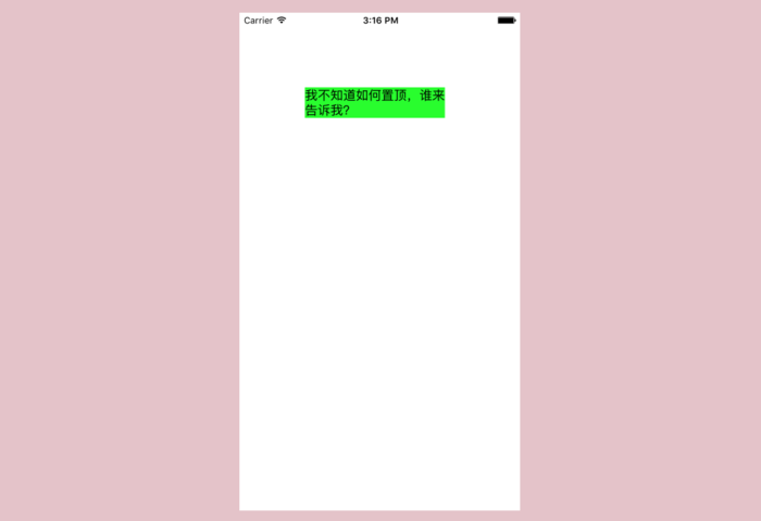 - (void)viewDidLoad { [super viewDidLoad]; UILabel *label = [[UILabel alloc] initWithFrame:CGRectMake((self.view.bounds.size.width - 200)/2, 100, 200, 150)]; label.backgroundColor = [UIColor yellowColor]; NSString *labelText = @"我不知道如何置頂,誰來告訴我?"; [label setText:labelText]; [label setNumberOfLines:0]; //讓內容置頂 [label sizeToFit]; [self.view addSubview:label];}