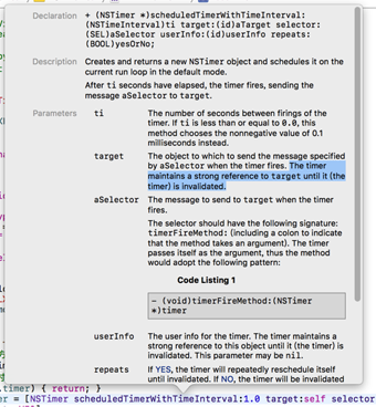 翻譯:定時器保持著對target的強引用,直到定時器作廢 那為什么LXFTimerView中的timer屬性要用weak?? 不用著急,下面即將揭曉~