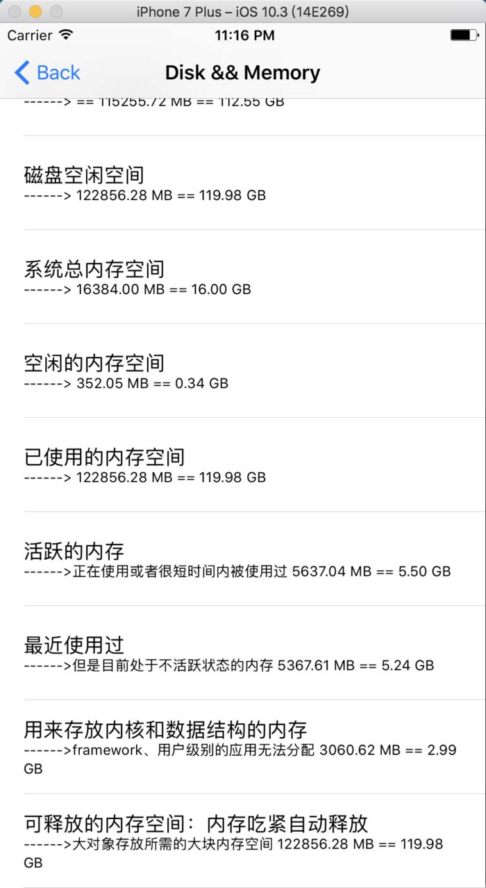 // 系統總內存空間- (int64_t)getTotalMemory { int64_t totalMemory = [[NSProcessInfo processInfo] physicalMemory]; if (totalMemory < -1) totalMemory = -1; return totalMemory;}// 活躍的內存,正在使用或者很短時間內被使用過- (int64_t)getActiveMemory { mach_port_t host_port = mach_host_self(); mach_msg_type_number_t host_size = sizeof(vm_statistics_data_t) / sizeof(integer_t); vm_size_t page_size; vm_statistics_data_t vm_stat; kern_return_t kern; kern = host_page_size(host_port, &page_size); if (kern != KERN_SUCCESS) return -1; kern = host_statistics(host_port, HOST_VM_INFO, (host_info_t)&vm_stat, &host_size); if (kern != KERN_SUCCESS) return -1; return vm_stat.active_count * page_size;}// 最近使用過,但是目前處于不活躍狀態的內存- (int64_t)getInActiveMemory { mach_port_t host_port = mach_host_self(); mach_msg_type_number_t host_size = sizeof(vm_statistics_data_t) / sizeof(integer_t); vm_size_t page_size; vm_statistics_data_t vm_stat; kern_return_t kern; kern = host_page_size(host_port, &page_size); if (kern != KERN_SUCCESS) return -1; kern = host_statistics(host_port, HOST_VM_INFO, (host_info_t)&vm_stat, &host_size); if (kern != KERN_SUCCESS) return -1; return vm_stat.inactive_count * page_size;}// 空閑的內存空間- (int64_t)getFreeMemory { mach_port_t host_port = mach_host_self(); mach_msg_type_number_t host_size = sizeof(vm_statistics_data_t) / sizeof(integer_t); vm_size_t page_size; vm_statistics_data_t vm_stat; kern_return_t kern; kern = host_page_size(host_port, &page_size); if (kern != KERN_SUCCESS) return -1; kern = host_statistics(host_port, HOST_VM_INFO, (host_info_t)&vm_stat, &host_size); if (kern != KERN_SUCCESS) return -1; return vm_stat.free_count * page_size;}// 已使用的內存空間- (int64_t)getUsedMemory { mach_port_t host_port = mach_host_self(); mach_msg_type_number_t host_size = sizeof(vm_statistics_data_t) / sizeof(integer_t); vm_size_t page_size; vm_statistics_data_t vm_stat; kern_return_t kern; kern = host_page_size(host_port, &page_size); if (kern != KERN_SUCCESS) return -1; kern = host_statistics(host_port, HOST_VM_INFO, (host_info_t)&vm_stat, &host_size); if (kern != KERN_SUCCESS) return -1; return page_size * (vm_stat.active_count + vm_stat.inactive_count + vm_stat.wire_count);}// 用來存放內核和數據結構的內存,framework、用戶級別的應用無法分配- (int64_t)getWiredMemory { mach_port_t host_port = mach_host_self(); mach_msg_type_number_t host_size = sizeof(vm_statistics_data_t) / sizeof(integer_t); vm_size_t page_size; vm_statistics_data_t vm_stat; kern_return_t kern; kern = host_page_size(host_port, &page_size); if (kern != KERN_SUCCESS) return -1; kern = host_statistics(host_port, HOST_VM_INFO, (host_info_t)&vm_stat, &host_size); if (kern != KERN_SUCCESS) return -1; return vm_stat.wire_count * page_size;}// 可釋放的內存空間:內存吃緊自動釋放,針對大對象存放所需的大塊內存空間- (int64_t)getPurgableMemory { mach_port_t host_port = mach_host_self(); mach_msg_type_number_t host_size = sizeof(vm_statistics_data_t) / sizeof(integer_t); vm_size_t page_size; vm_statistics_data_t vm_stat; kern_return_t kern; kern = host_page_size(host_port, &page_size); if (kern != KERN_SUCCESS) return -1; kern = host_statistics(host_port, HOST_VM_INFO, (host_info_t)&vm_stat, &host_size); if (kern != KERN_SUCCESS) return -1; return vm_stat.purgeable_count * page_size;}