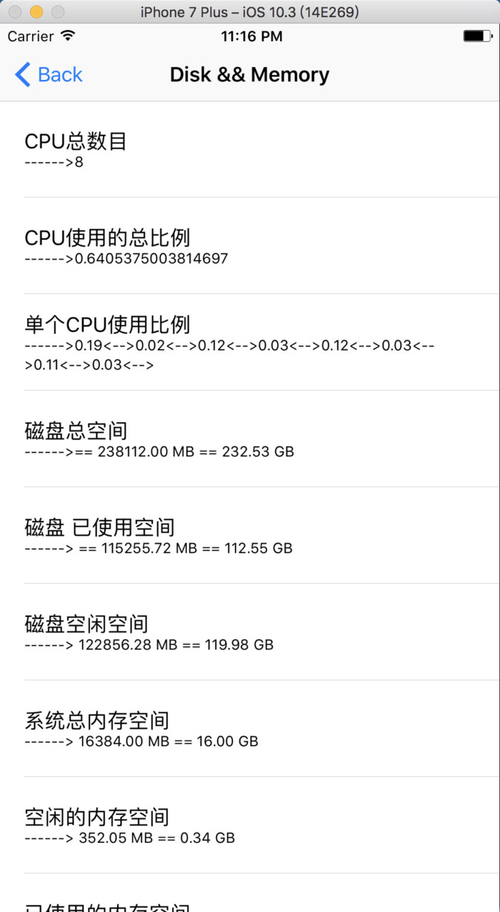 // CPU總數目- (NSUInteger)getCPUCount { return [NSProcessInfo processInfo].activeProcessorCount;}// 已使用的CPU比例- (float)getCPUUsage { float cpu = 0; NSArray *cpus = [self getPerCPUUsage]; if (cpus.count == 0) return -1; for (NSNumber *n in cpus) { cpu += n.floatValue; } return cpu;}// 獲取每個cpu的使用比例- (NSArray *)getPerCPUUsage { processor_info_array_t _cpuInfo, _prevCPUInfo = nil; mach_msg_type_number_t _numCPUInfo, _numPrevCPUInfo = 0; unsigned _numCPUs; NSLock *_cpuUsageLock; int _mib[2U] = { CTL_HW, HW_NCPU }; size_t _sizeOfNumCPUs = sizeof(_numCPUs); int _status = sysctl(_mib, 2U, &_numCPUs, &_sizeOfNumCPUs, NULL, 0U); if (_status) _numCPUs = 1; _cpuUsageLock = [[NSLock alloc] init]; natural_t _numCPUsU = 0U; kern_return_t err = host_processor_info(mach_host_self(), PROCESSOR_CPU_LOAD_INFO, &_numCPUsU, &_cpuInfo, &_numCPUInfo); if (err == KERN_SUCCESS) { [_cpuUsageLock lock]; NSMutableArray *cpus = [NSMutableArray new]; for (unsigned i = 0U; i < _numCPUs; ++i) { Float32 _inUse, _total; if (_prevCPUInfo) { _inUse = ( (_cpuInfo[(CPU_STATE_MAX * i) + CPU_STATE_USER] - _prevCPUInfo[(CPU_STATE_MAX * i) + CPU_STATE_USER]) + (_cpuInfo[(CPU_STATE_MAX * i) + CPU_STATE_SYSTEM] - _prevCPUInfo[(CPU_STATE_MAX * i) + CPU_STATE_SYSTEM]) + (_cpuInfo[(CPU_STATE_MAX * i) + CPU_STATE_NICE] - _prevCPUInfo[(CPU_STATE_MAX * i) + CPU_STATE_NICE]) ); _total = _inUse + (_cpuInfo[(CPU_STATE_MAX * i) + CPU_STATE_IDLE] - _prevCPUInfo[(CPU_STATE_MAX * i) + CPU_STATE_IDLE]); } else { _inUse = _cpuInfo[(CPU_STATE_MAX * i) + CPU_STATE_USER] + _cpuInfo[(CPU_STATE_MAX * i) + CPU_STATE_SYSTEM] + _cpuInfo[(CPU_STATE_MAX * i) + CPU_STATE_NICE]; _total = _inUse + _cpuInfo[(CPU_STATE_MAX * i) + CPU_STATE_IDLE]; } [cpus addObject:@(_inUse / _total)]; } [_cpuUsageLock unlock]; if (_prevCPUInfo) { size_t prevCpuInfoSize = sizeof(integer_t) * _numPrevCPUInfo; vm_deallocate(mach_task_self(), (vm_address_t)_prevCPUInfo, prevCpuInfoSize); } return cpus; } else { return nil; }}