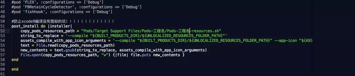 post_install do |installer| copy_pods_resources_path = "Pods/Target Support Files/Pods-工程名/Pods-工程名-resources.sh" string_to_replace = '--compile "${BUILT_PRODUCTS_DIR}/${UNLOCALIZED_RESOURCES_FOLDER_PATH}"' assets_compile_with_app_icon_arguments = '--compile "${BUILT_PRODUCTS_DIR}/${UNLOCALIZED_RESOURCES_FOLDER_PATH}" --app-icon "${ASSETCATALOG_COMPILER_APPICON_NAME}" --output-partial-info-plist "${BUILD_DIR}/assetcatalog_generated_info.plist"' text = File.read(copy_pods_resources_path) new_contents = text.gsub(string_to_replace, assets_compile_with_app_icon_arguments) File.open(copy_pods_resources_path, "w") {|file| file.puts new_contents }end