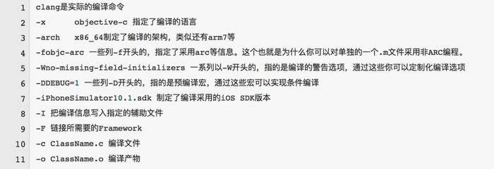 1.CompileC ClassName.o ClassName.m normal x86_64 objective-c com.apple.compilers.llvm.clang.1_0.compiler2.export.US-ASCII3.export PATH="..."4.clang-x objective-c -arch x86_64 -fmessage-length=0 -fobjc-arc...-Wno-missing-field-initializers ... -DDEBUG=1 ... -isysrootiPhoneSimulator10.1.sdk -fasm-blocks ... -I 上文提到的文件 -F 所需要的Framework-iquote 所需要的Framework ... -c ClassName.c -o ClassName.o