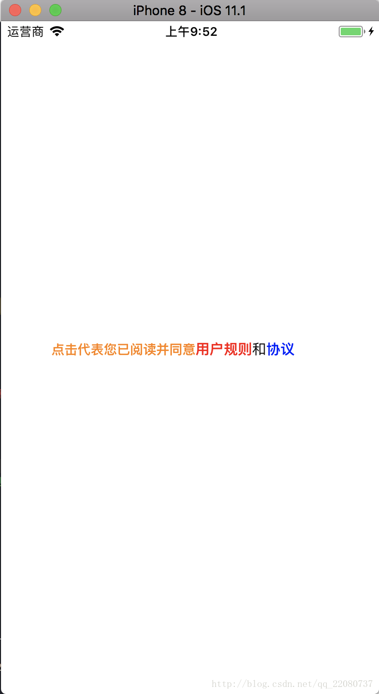 NSMutableAttributedString *str = [[NSMutableAttributedString alloc] initWithString:@"點擊代表您已閱讀并同意用戶規則和協議"];[str addAttribute:NSForegroundColorAttributeName value:[UIColor orangeColor] range:NSMakeRange(0,11)];[str addAttribute:NSForegroundColorAttributeName value:[UIColor redColor] range:NSMakeRange(11,4)];[str addAttribute:NSForegroundColorAttributeName value:[UIColor blueColor] range:NSMakeRange(16,2)];label.attributedText = str;