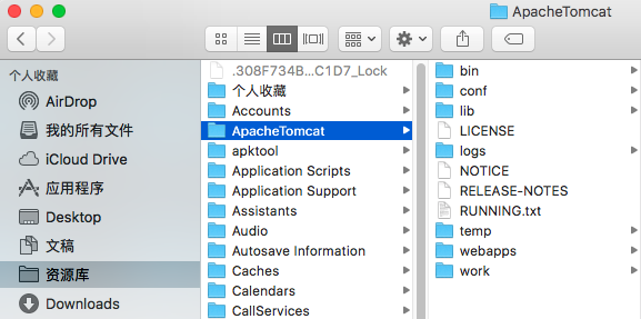 2.下載之后,將解壓后的的整個文件夾重新命名:ApacheTomcat(這個名字隨便起),然后放在一個文件目錄下,我把它放在了:/Users/電腦用戶名/Library下;
