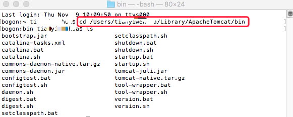 3.打開終端進入ApacheTomcat文件里的bin文件夾目錄;