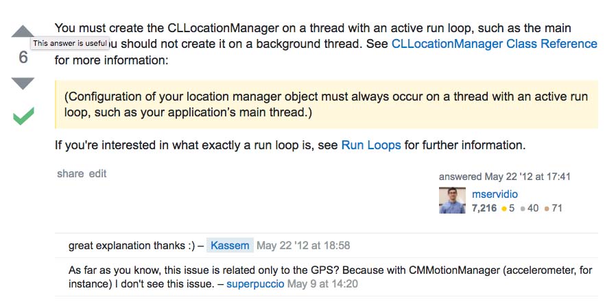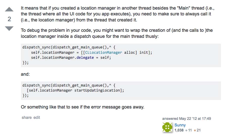 中文翻譯為:一個定位管理者創建在子線程,而不是主線程.在開發中,要確保一個定位管理者所在的線程要在運行循環(Run loop)中.在實際開發中,當在子線程中創建定位管理者,有可能收不到回調信息.
