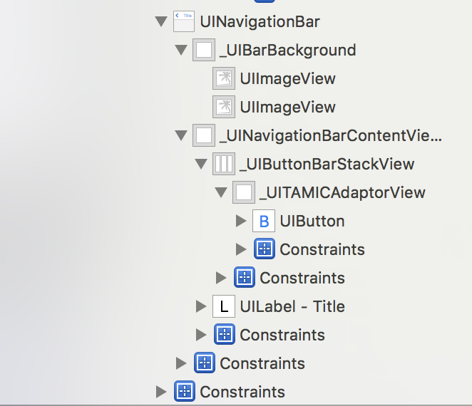 在iOS11之后,蘋果添加了新的類來管理,可以看到titleView直接加在_UINavigationBarContentView上,UIBarButtonItem則添加在_UIButtonBarStackView上面,而_UIButtonBarStackView則添加在_UINavigationBarContentView上面,最后添加到UINavigationBar上面,如下圖所示: