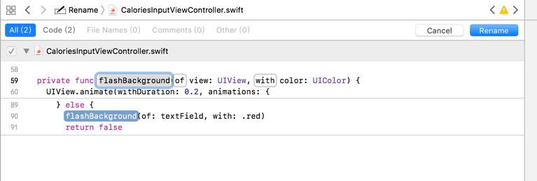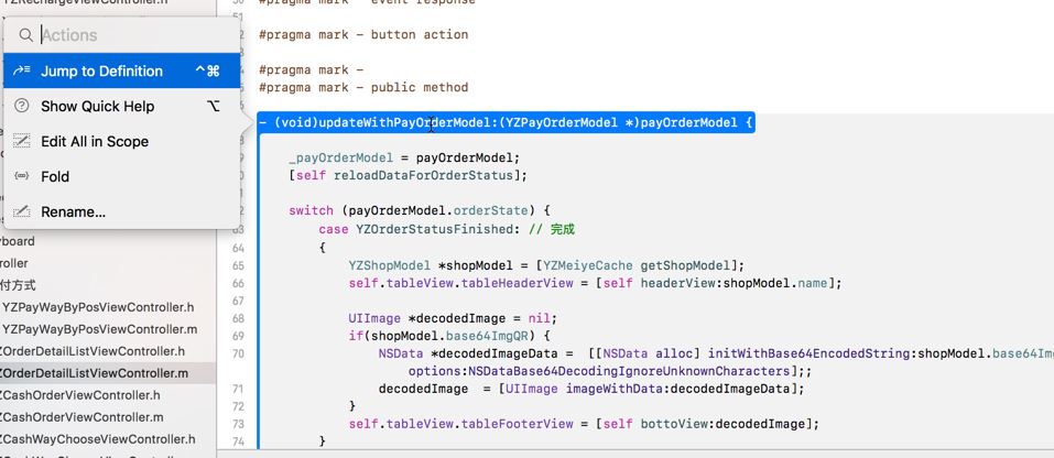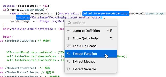 常用的重構(gòu)方式都已經(jīng)集成在這個右鍵彈出菜單中了,可見,XCode9對于重構(gòu)的支持度又增加了,以后重構(gòu)代碼將更加方便快捷