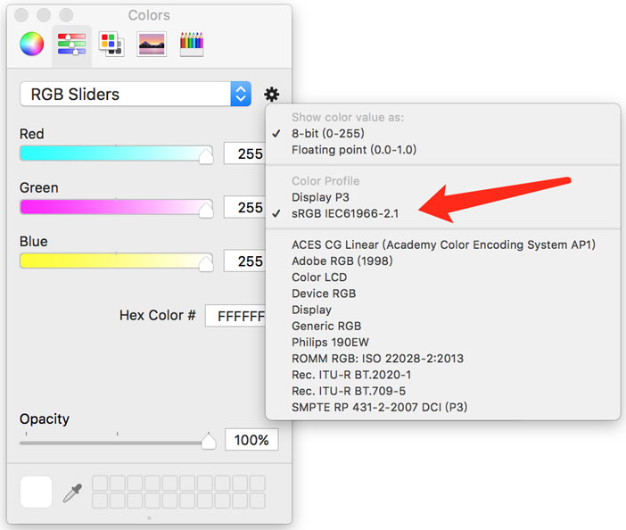 我們設置完rgb色后和你想要的略有差別。這里提供一個解決辦法。設置顏色的時候,點擊右邊的小齒輪,選擇 sRGB。