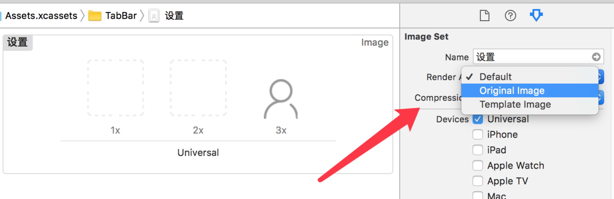 不用寫亂七八糟的代碼,直接到 Assets.xcassets 里把圖片的屬性 Render 設置為 Original Image 就可以讓顏色按照圖片的來,而不會選中變藍了。